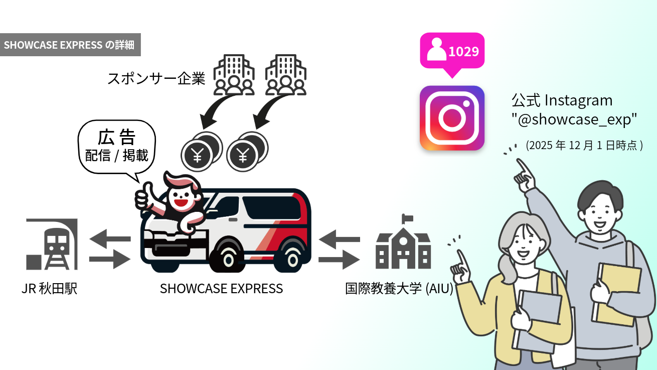 「SHOWCASE EXPRESS」は、国際教養大学とJR秋田駅を結ぶ無料シャトルバスです。このサービスの運営は、スポンサー企業の広告費用によって支えられています。